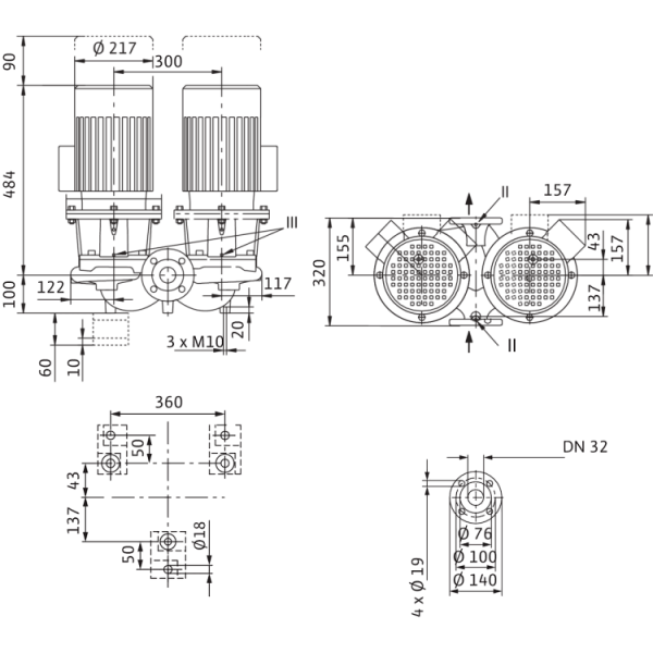 Линейный сдвоенный насос с двумя одноступенчатыми центробежными насосами с сухим ротором в общем корпусе с перекидным клапаном для установки в трубах или на фундаменте. Фланцевая заглушка корпуса и консоли предоставляются за отдельную плату. Блочное исполнение с низким уровнем шума и вибрации с промежуточным корпусом и неподвижно присоединенным унифицированным (стандартным) электродвигателем с фланцевым креплением. С не зависящим от направления вращения скользящим торцовым уплотнением в кожухе с принудительным охлаждением и снижающим кавитацию рабочим колесом. Фланцы имеют отверстия R 1/8 для измерения давления. На корпус насоса и промежуточный корпус нанесено катафорезное покрытие.