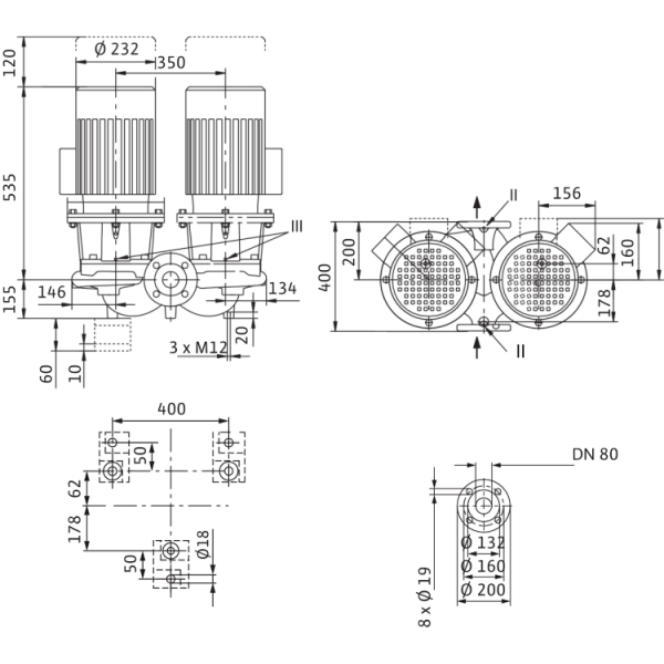 Линейный сдвоенный насос с двумя одноступенчатыми центробежными насосами с сухим ротором в общем корпусе с перекидным клапаном для установки в трубах или на фундаменте. Фланцевая заглушка корпуса и консоли предоставляются за отдельную плату. Блочное исполнение с низким уровнем шума и вибрации с промежуточным корпусом и неподвижно присоединенным унифицированным (стандартным) электродвигателем с фланцевым креплением. С не зависящим от направления вращения скользящим торцовым уплотнением в кожухе с принудительным охлаждением и снижающим кавитацию рабочим колесом. Фланцы имеют отверстия R 1/8 для измерения давления. На корпус насоса и промежуточный корпус нанесено катафорезное покрытие.