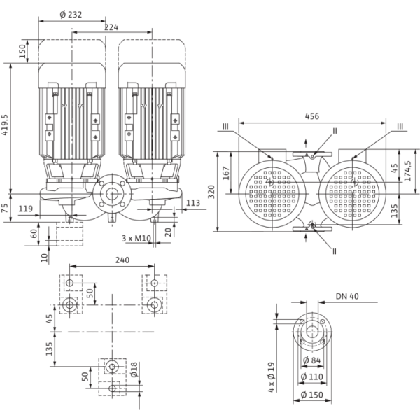 Линейный сдвоенный насос с двумя одноступенчатыми центробежными насосами с сухим ротором в общем корпусе с перекидным клапаном в напорном патрубке. Компактный насос линейного типа с непосредственно прифланцованным электродвигателем трехфазного тока и неразъемными валами или с промежуточными корпусами и муфтами жестко соединенных унифицированных электродвигателей (исполнение N).