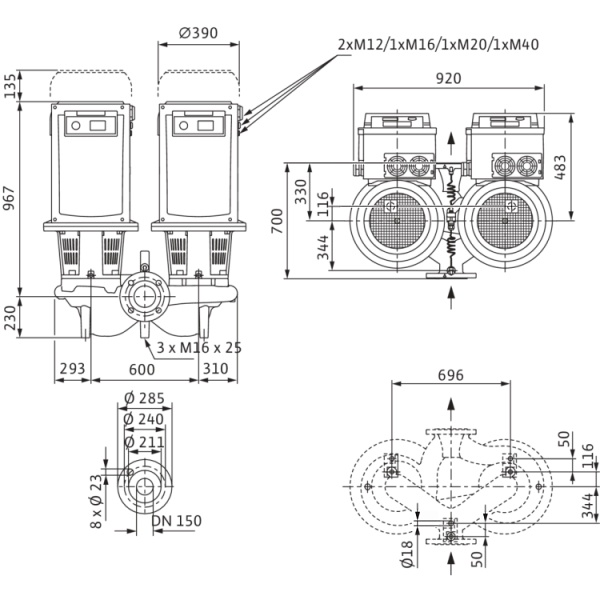 Электронно регулируемый сдвоенный насос с сухим ротором в исполнении Inline, с фланцевым соединением и автоматической регулировкой мощности