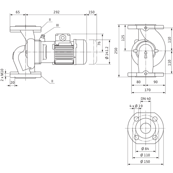 Насос с сухим ротором в линейном исполнении с резьбовым или фланцевым подсоединением.