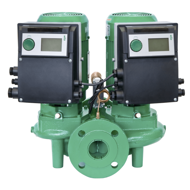 Электронно регулируемый сдвоенный насос с сухим ротором в исполнении Inline, с фланцевым соединением и автоматической регулировкой мощности