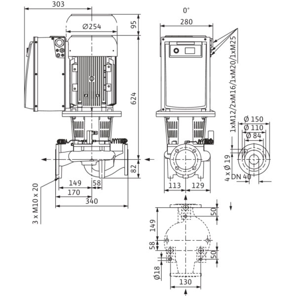 - Спиральный корпус линейного исполнения (всасывающий и напорный патрубок с одинаковыми фланцами в одной линии), фланец PN 16 – с отверстием согласно EN 1092-2