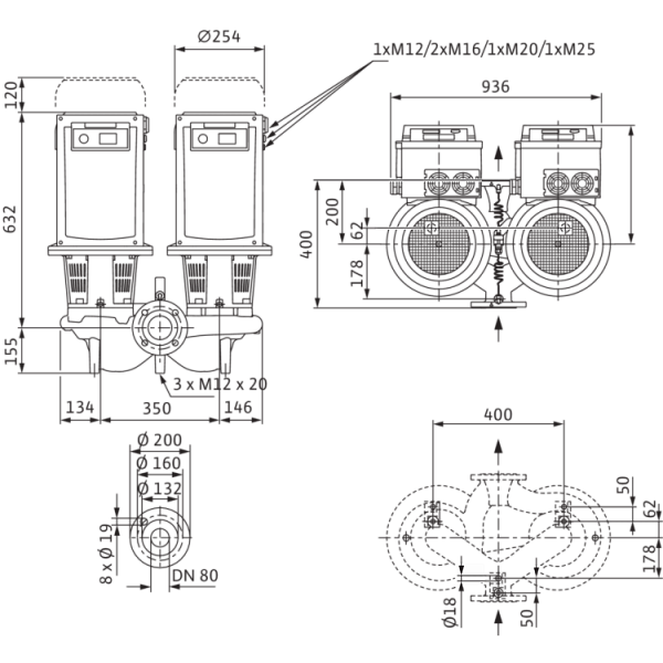 Сдвоенный насос с сухим ротором линейного типа для установки в трубах или на фундаменте со встроенным частотным преобразователем для электронного регулирования параметров, в том числе постоянного или переменного перепада давления (Δp-c/Δp-v).