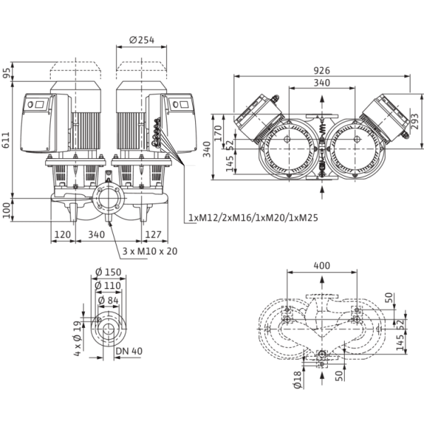 Сдвоенный насос с сухим ротором линейного типа для установки в трубах или на фундаменте со встроенным частотным преобразователем для электронного регулирования параметров, в том числе постоянного или переменного перепада давления (Δp-c/Δp-v).