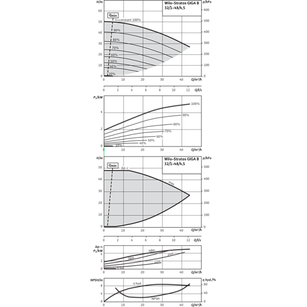 Базовое значение MEI для насосов с оптимальным КПД ≥ 0,70.КПД насоса с откорректированным рабочим колесом, как правило, ниже КПД насоса с полным диаметром рабочего колеса. За счет корректировки рабочего колеса насос настраивается на определенную рабочую точку, в результате чего снижается энергопотребление. Индекс минимальной эффективности (MEI) относится к полному диаметру рабочего колеса.При различных рабочих точках данный насос может работать эффективнее и экономичнее, если, например, управление его работой осуществляется путем регулирования переменной частоты вращения, благодаря которому насос адаптируется к характеристикам соответствующей системы.Информацию по базовому значению эффективности см. на интернет-странице www.europump.org/efficiencycharts.На насосы, потребляющие мощность > 150 кВт, или имеющие подачу QBEP < 6 м3/ч, не распространяются требования по экологическому проектированию водяных насосов. Поэтому значение MEI не указывается.
