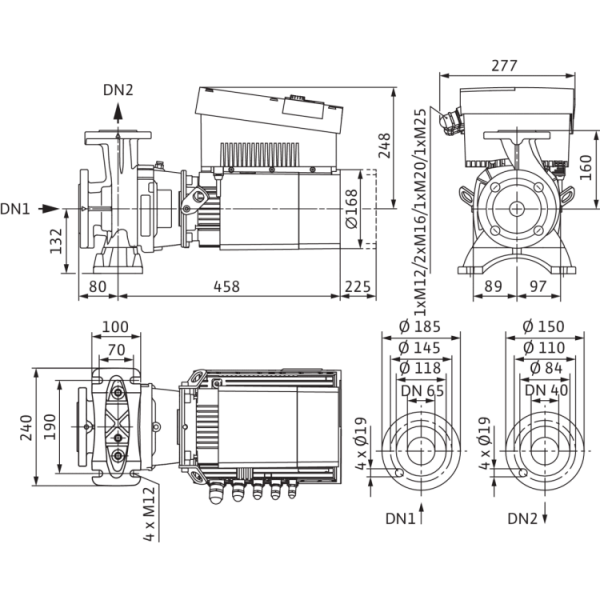 - аналоговые интерфейсы 0-10 В, 2-10 В, 0-20 мА, 4-20 мА, встроенная система управления сдвоенными насосами для использования в разветвленном трубопроводе, два настраиваемых реле оповещения для сообщений об эксплуатации или неисправностях, настраиваемый порядок действий при аварии в системах отопления и кондиционирования, блокировка доступа к насосу, встроенная полная защита электродвигателя (KLF) с электронной системой отключения, серийные отверстия для отвода конденсата в корпусе электродвигателя (при поставке закрыты), инфракрасный интерфейс для беспроводной связи с управляющим и сервисным устройством – IR-монитором Wilo и IR-накопителем Wilo, разъем для IF-модуля Wilo Modbus, BACnet, CAN, PLR, LON для связи с автоматизированной системой управления зданием.