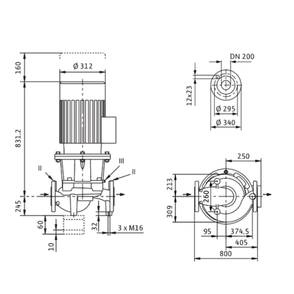 Одноступенчатый центробежный насос с сухим ротором линейного типа, предназначенный для установки в трубах или на фундаменте. Блочная конструкция с низким уровнем шума и вибрации, с фонарем и неподвижно присоединенным стандартным электродвигателем с фланцевым креплением (стандартный электродвигатель). С не зависящим от направления вращения скользящим торцевым уплотнением в кожухе с принудительным охлаждением и снижающим кавитацию рабочим колесом. Фланцы имеют штуцеры R 1/8 для измерения давления. На корпус насоса и промежуточный корпус нанесено катафорезное покрытие. Клеммная коробка электродвигателя ≤ 7,5 кВт может быть изготовлена из металла или синтетического материала. Если для электродвигателя требуется металлическая клеммная коробка, закажите соответствующее специальное исполнение. Клеммные коробки электродвигателя > 7,5 кВт всегда из металла.