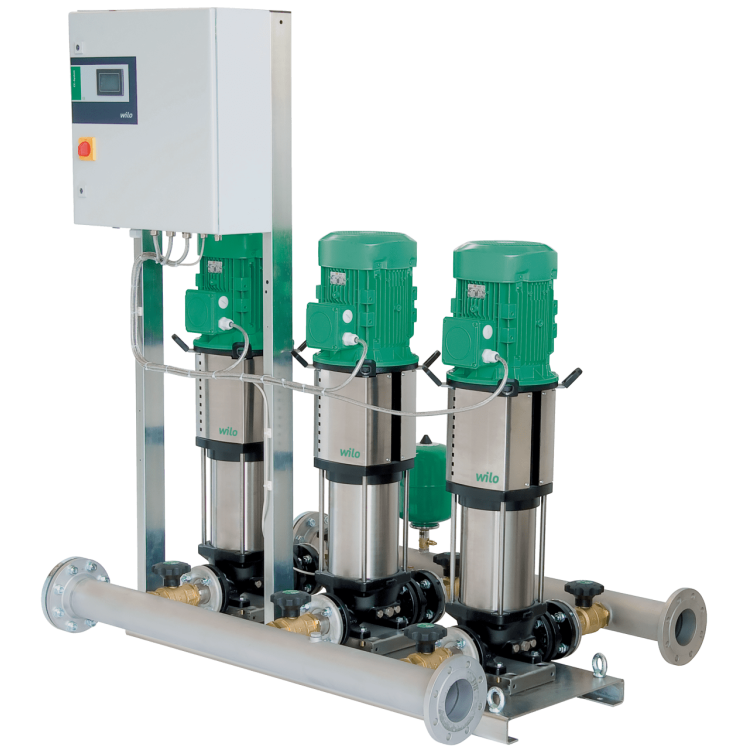 Компактная установка повышения давления согласно стандарту DIN 1988 и DIN EN 806, для прямого или опосредованного подсоединения. Состоит из нормальновсасывающих параллельно подключенных вертикальных высоконапорных центробежных насосов из нержавеющей стали с сухим ротором. Готовность к подключению, установка на опорной раме с системой трубопроводов из нержавеющей стали, включая прибор управления со всеми необходимыми измерительными и регулировочными устройствами.