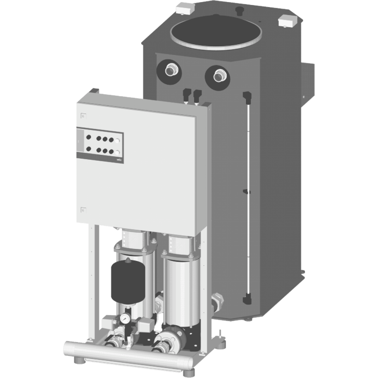 Приемный резервуар (540 л) с разрешением к применению в питьевом водоснабжении. Нормальновсасывающий вертикальный многоступенчатый высоконапорный центробежный насос из нержавеющей стали с трехфазным электродвигателем. Уплотнение вала посредством стандартного скользящего торцового уплотнения кассетного типа (насосы Helix). Мембранный напорный бак (объем 8 л), интегрированный обратный клапан, запорная арматура с всасывающей и напорной стороны (заблокирована от случайного включения), манометрический выключатель и манометр для автоматического управления установкой. В серийном исполнении с защитой насоса посредством отбора минимальных объемов через байпас, без вспомогательной энергии