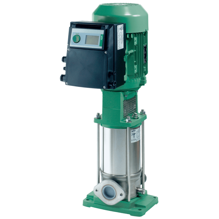 Нормальновсасывающий многосекционный вертикальный высоконапорный центробежный насос во встраиваемом исполнении со встроенным частотным преобразователем с воздушным охлаждением. Встроенный частотный преобразователь позволяет варьировать частоту вращения, регулировать давление и производить ПИД-регулирование.