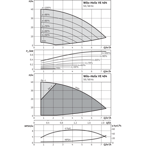 Общие указания – директивы ErP (экологический дизайн) Базовое значение MEI для насосов с оптимальным КПД ≥ 0,70.КПД насоса с откорректированным рабочим колесом, как правило, ниже КПД насоса с полным диаметром рабочего колеса. За счет корректировки рабочего колеса насос настраивается на определенную рабочую точку, в результате чего снижается энергопотребление. Индекс минимальной эффективности (MEI) относится к полному диаметру рабочего колеса.При различных рабочих точках данный насос может работать эффективнее и экономичнее, если, например, управление его работой осуществляется путем регулирования переменной частоты вращения, благодаря которому насос адаптируется к характеристикам соответствующей системы.Информацию по базовому значению эффективности см. на интернет-странице www.europump.org/efficiencycharts.На насосы, потребляющие мощность > 150 кВт, или имеющие подачу QBEP < 6 м3/ч, не распространяются требования по экологическому проектированию водяных насосов. Поэтому значение MEI не указывается. |