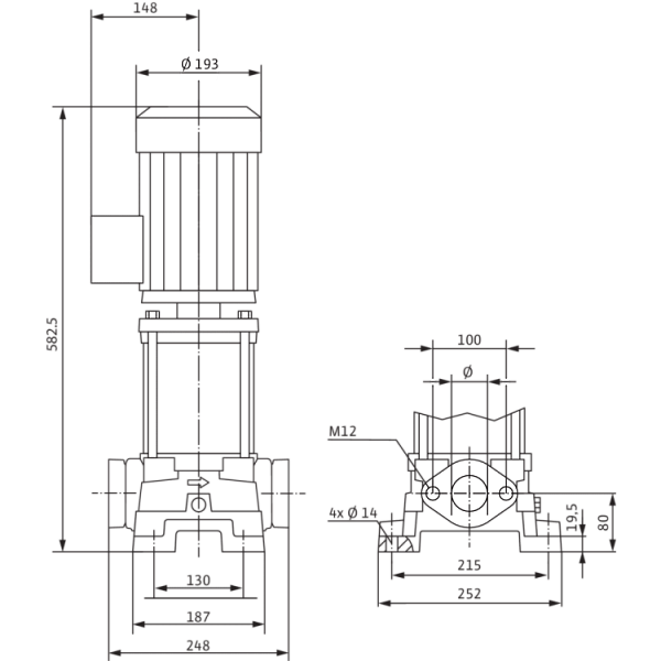 Данный насос имеет компактную конструкцию и оснащен сквозным насосным валом электродвигателя и не зависящим от направления вращения скользящим торцовым уплотнением. Секции, рабочие и ведущие колеса выполнены из нержавеющей стали. Корпус насоса выполнен из чугуна с катафорезным покрытием с подсоединениями под овальный фланец.