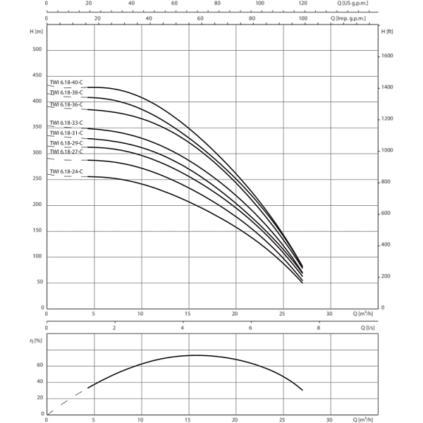 Многоступенчатый погружной насос с муфтой NEMA 4" или 6" и радиальными или полуаксиальными рабочими колесами в секционном исполнении. Встроенный обратный клапан. Все детали, соприкасающиеся с перекачиваемой жидкостью, выполнены из коррозионностойких материалов.