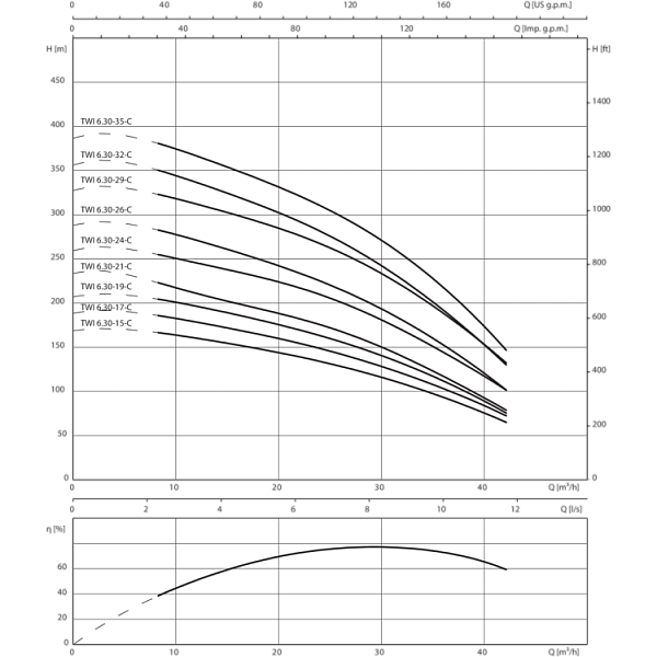 Многоступенчатый погружной насос с муфтой NEMA 4" или 6" и радиальными или полуаксиальными рабочими колесами в секционном исполнении. Встроенный обратный клапан. Все детали, соприкасающиеся с перекачиваемой жидкостью, выполнены из коррозионностойких материалов.