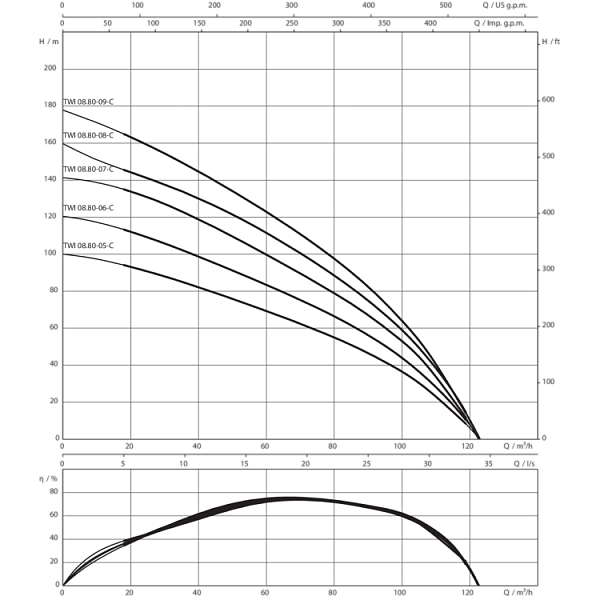 Многоступенчатый погружной насос с 6" или 8" NEMA‐подключениями и полуаксиальными рабочими колесами в секционном исполнении. Встроенный обратный клапан. Все детали, соприкасающиеся с перекачиваемой жидкостью, выполнены из коррозионностойких материалов.