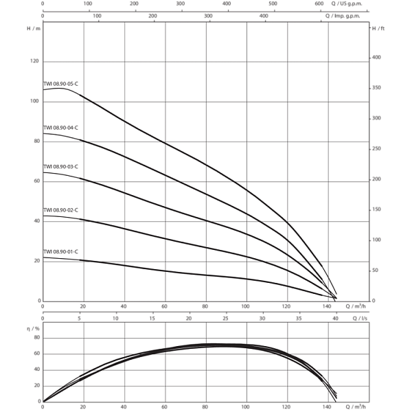 Многоступенчатый погружной насос с 6" или 8" NEMA‐подключениями и полуаксиальными рабочими колесами в секционном исполнении. Встроенный обратный клапан. Все детали, соприкасающиеся с перекачиваемой жидкостью, выполнены из коррозионностойких материалов.