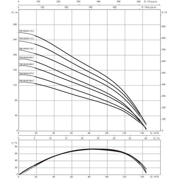 Многоступенчатый погружной насос с 6" или 8" NEMA‐подключениями и полуаксиальными рабочими колесами в секционном исполнении. Встроенный обратный клапан. Все детали, соприкасающиеся с перекачиваемой жидкостью, выполнены из коррозионностойких материалов.