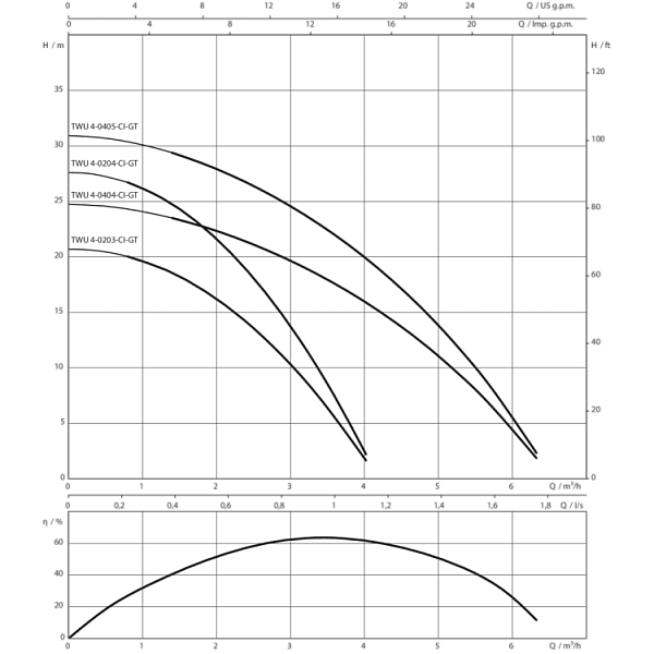 Полностью погружной многоступенчатый насос с радиальными или полуосевыми рабочими колесами в секционном исполнении для вертикального или горизонтального монтажа со встроенным обратным клапаном. Стойкий к коррозии трехфазный электродвигатель для прямого пуска с водогликолевой смесью. Полностью герметичные и пропитанные смолой самосмазывающиеся подшипники с обмоткой с изолирующей лакировкой. Охлаждение электродвигателя происходит за счет перекачиваемых жидкостей. Поэтому горизонтальный монтаж должен выполняться с охлаждающим кожухом. Для перекачивания воды для геотермических систем с максимальной глубиной погружения 200 м и максимальным содержанием песка 50 г/м³. Вариант исполнения QC оснащен быстросъемным соединительным кабелем для простой и быстрой замены электрического кабеля.