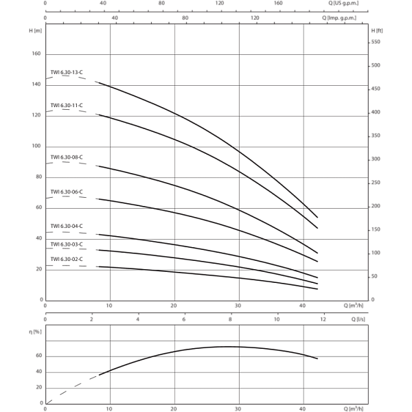 Базовое значение MEI для насосов с оптимальным КПД ≥ 0,70.КПД насоса с откорректированным рабочим колесом, как правило, ниже КПД насоса с полным диаметром рабочего колеса. За счет корректировки рабочего колеса насос настраивается на определенную рабочую точку, в результате чего снижается энергопотребление. Индекс минимальной эффективности (MEI) относится к полному диаметру рабочего колеса.При различных рабочих точках данный насос может работать эффективнее и экономичнее, если, например, управление его работой осуществляется путем регулирования переменной частоты вращения, благодаря которому насос адаптируется к характеристикам соответствующей системы.Информацию по базовому значению эффективности см. на интернет-странице www.europump.org/efficiencycharts.